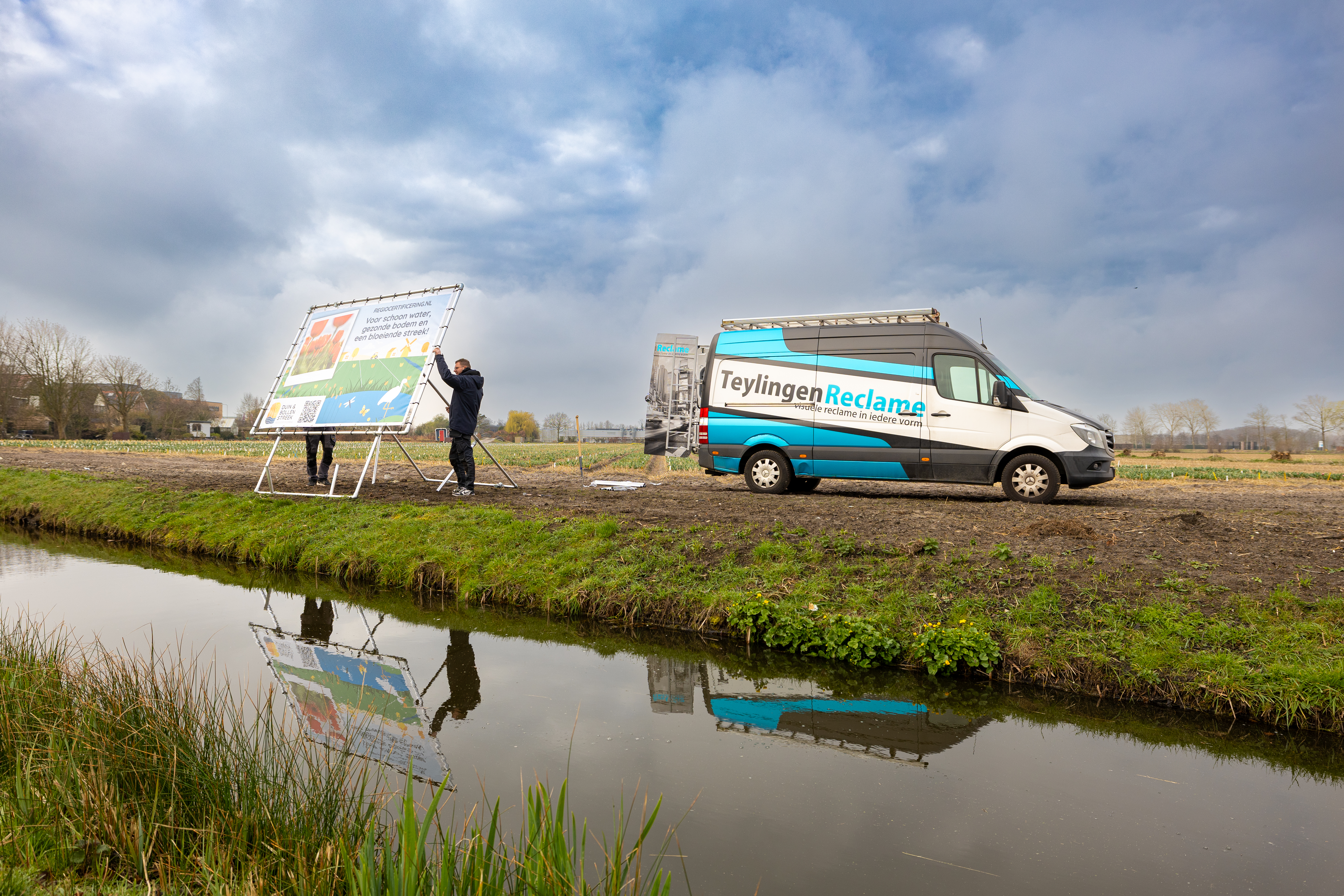 Het plaatsen van het bord door Teylingen Reclame voor ons tulpenveredelingsveld.