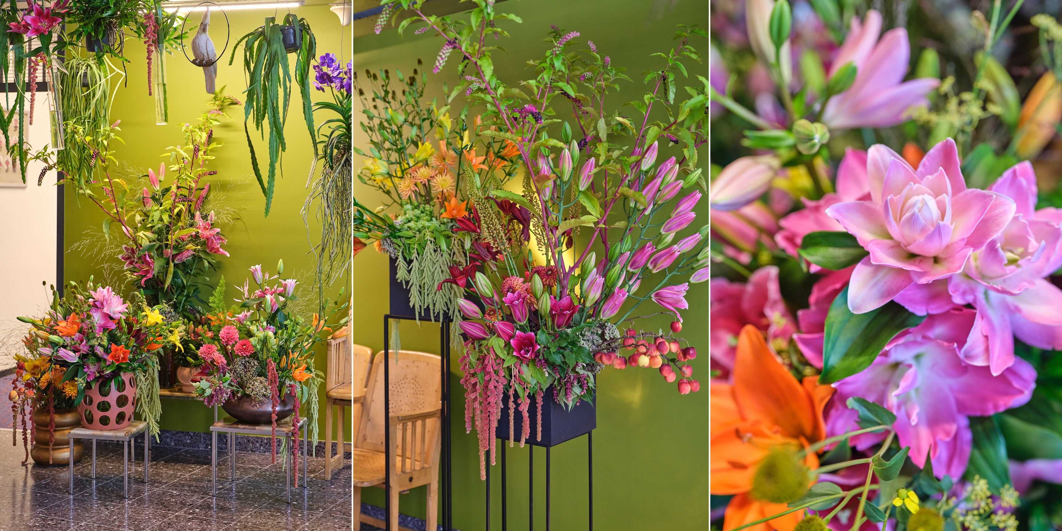 In onze lelie trendpresentatie zijn kleuren zoals oranje, geel en warm roze, gecombineerd met sculpturale vazen en botanische accenten. Het is niet alleen bloemwerk — het is kunst in je interieur. Maximalisme met karakter. Wilde takken en nostalgische prints voegen extra charme toe.